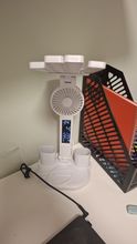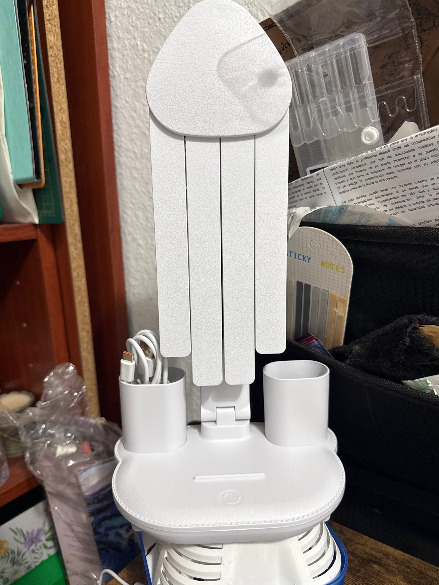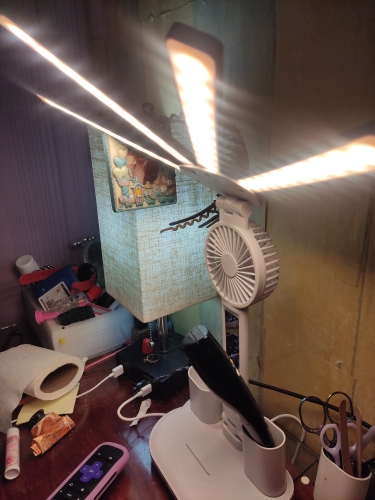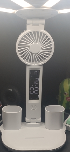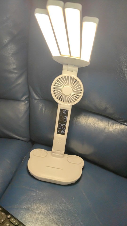 It's very pretty, it's very nice and you can use it anytime, and it comes with rechargeable batteries so you'll never be without power or have to buy batteries. It lasts a long time. I have another one that only has two lights and I've had it for about three years. This one has four lights and comes with a fan. I highly recommend it; it's a good purchase and very durable. It shows the temperature and has a calendar clock. I recommend it.
