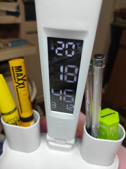 LED lamp shines well with three modes + smooth brightness adjustment, display with clock and thermometer, informative packaging was slightly damaged but the lamp is intact and works well.