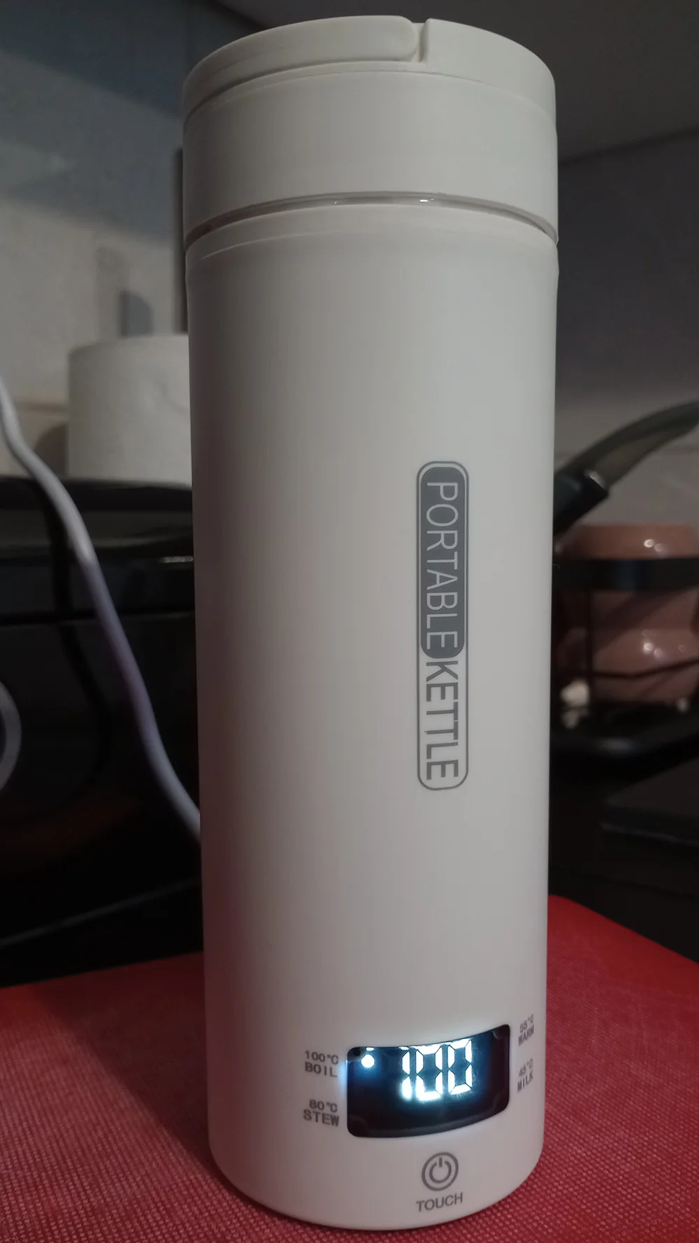 cool teapot-bottle!! water does not spill out if turned over with the lid closed!! temperature support, of course, you need to buy one with dual power supply (12/220v) next time))). I haven't determined the support temperature yet, when choosing 100. ° C, but unfortunately it is below 78. ° It doesn't allow using the kettle, it heats slowly))) but as a miniature kettle, with the ability to carry boiling water horizontally, with temperature selection and control - it's worth the money. Very suitable for my work. By the way, this is a good gift!! Delivery to Siberia - 1 week.