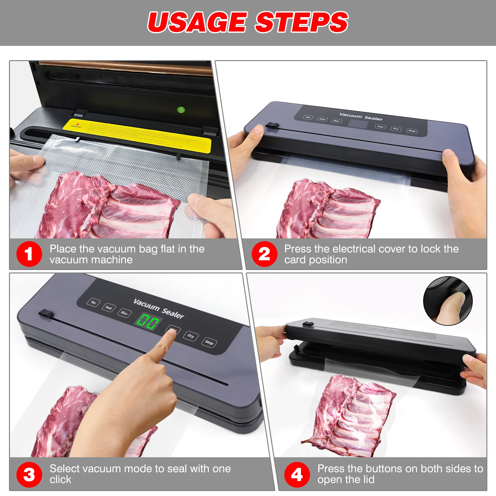 【5 Modes For Meal Needs】Dry mode is perfect for vacuuming and sealing dry foods like sausages and other non-liquid items; Vacuum mode allows you to control the vacuuming time manually; for quick bag sealing without vacuuming, such as foil-wrapped potato chip bags or snack bags, use Seal mode; Wet mode is designed for vacuuming wet food and say goodbye to soggy vegetables and leaky sauces; Perfect for meal prep, Rice mode ensures your rice stays fluffy and delicious, even after days in the fridge.