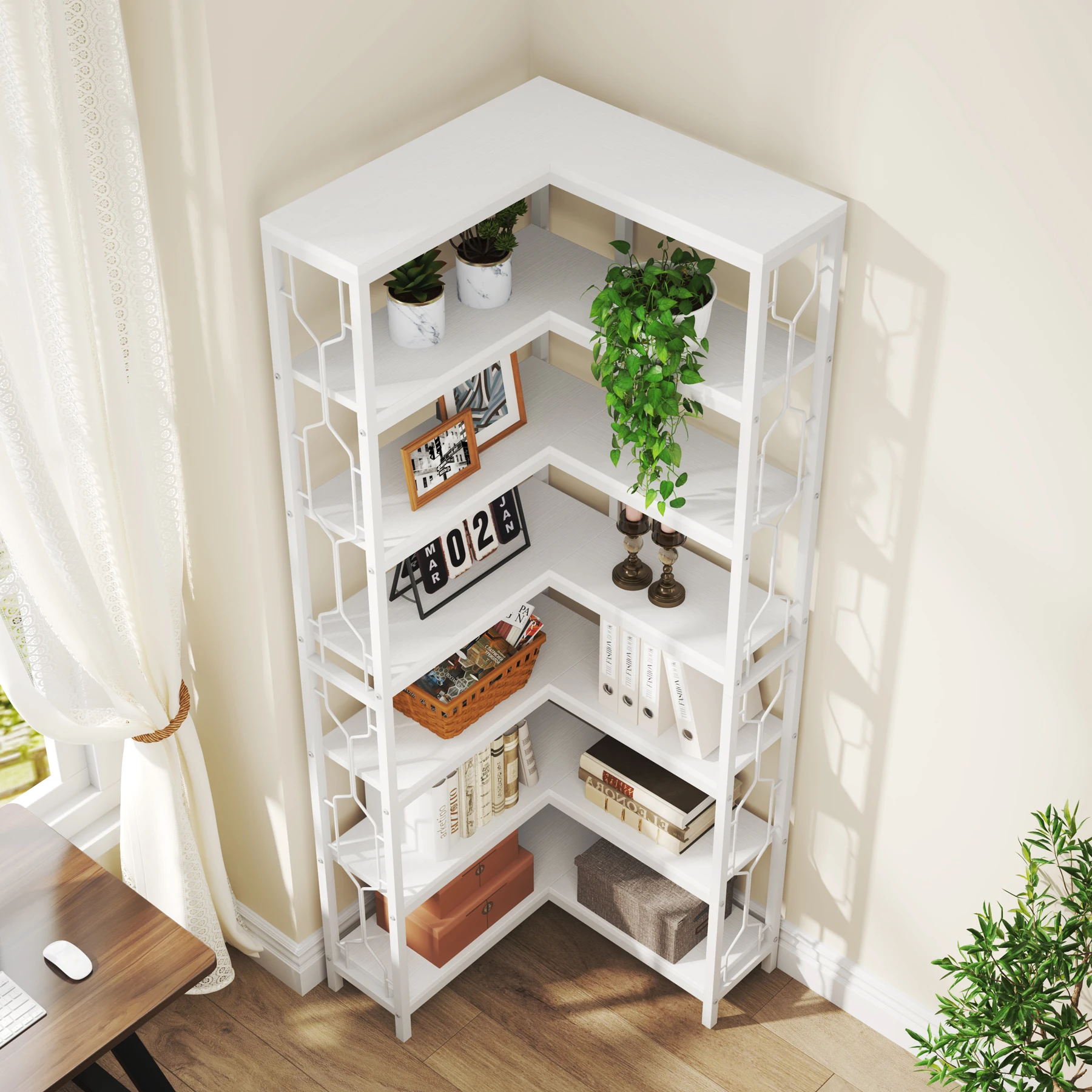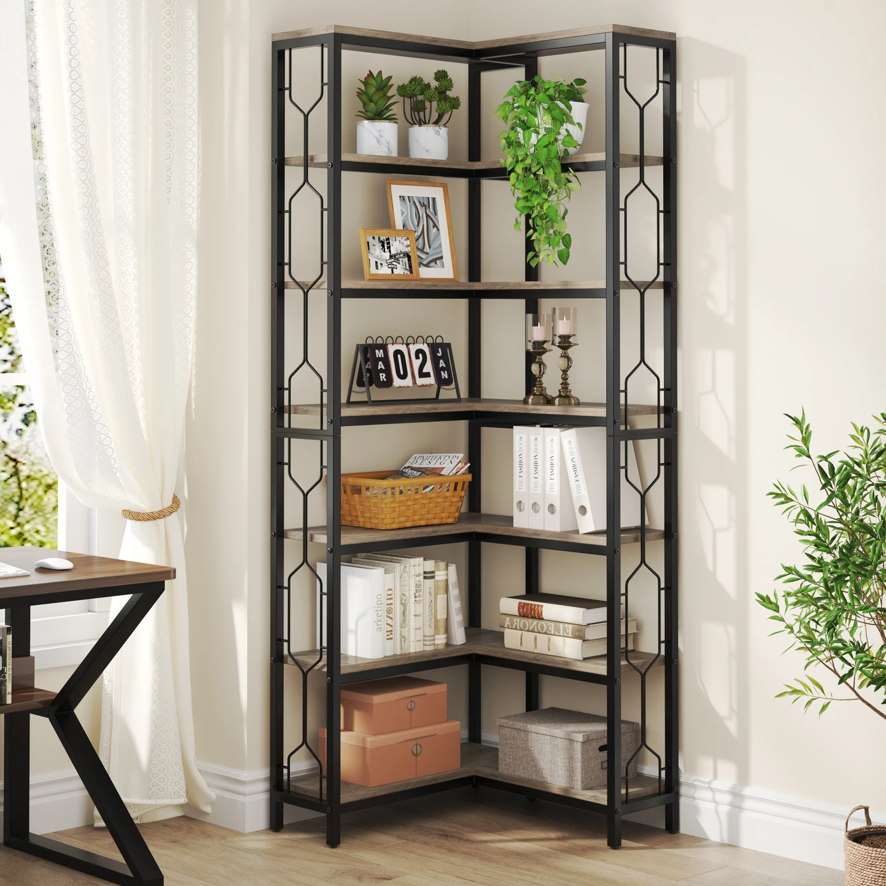 Corner BookShelf 7-Tier Wood and Metal Freestanding