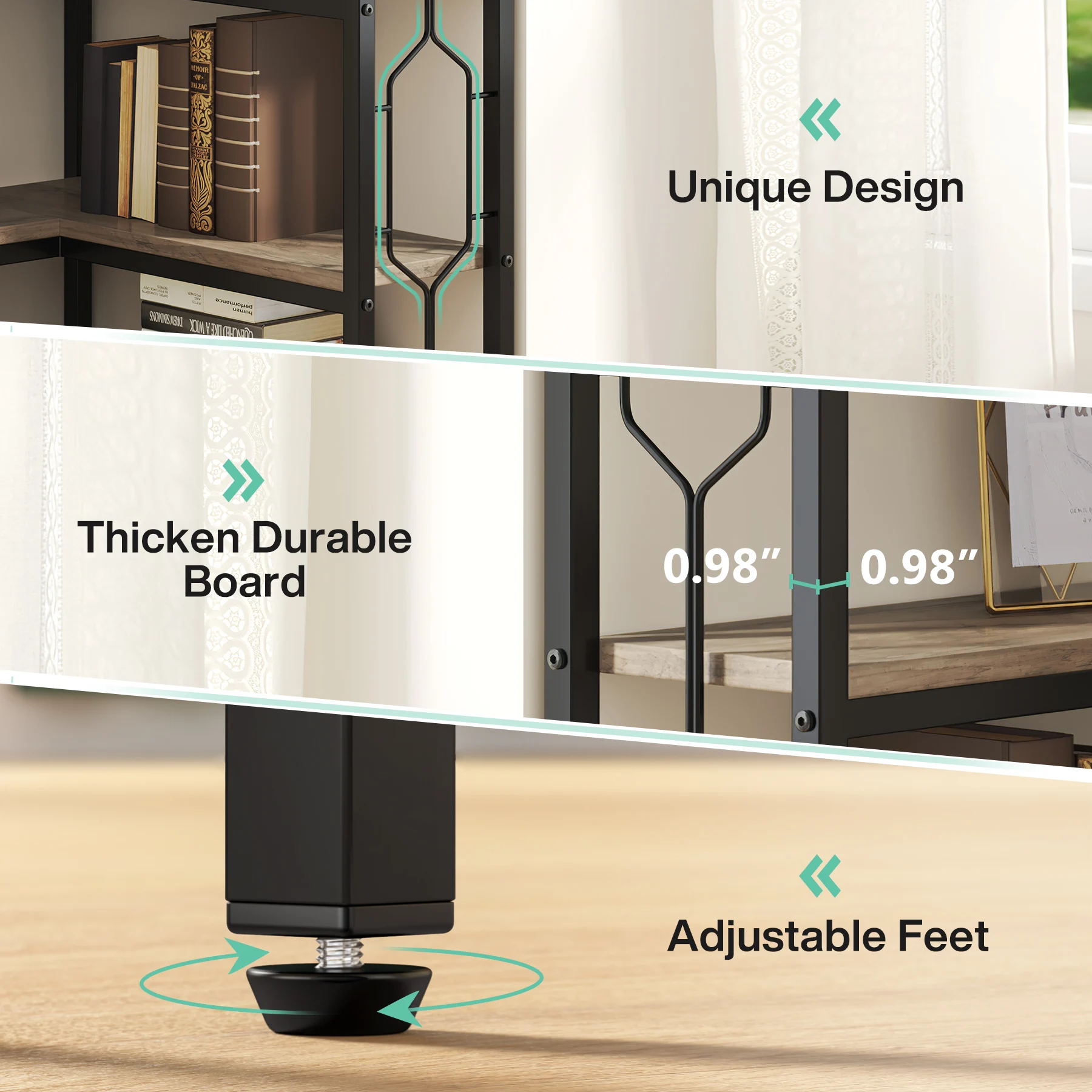 • A SOLID CORNER BOOKCASE: The industrial corner bookshelf is constructed of high quality E0 particle board and black metal frame. The robust combination of strengthened square metal tubes and hard-wearing wood provides the standing shelf with a high degree of stability.