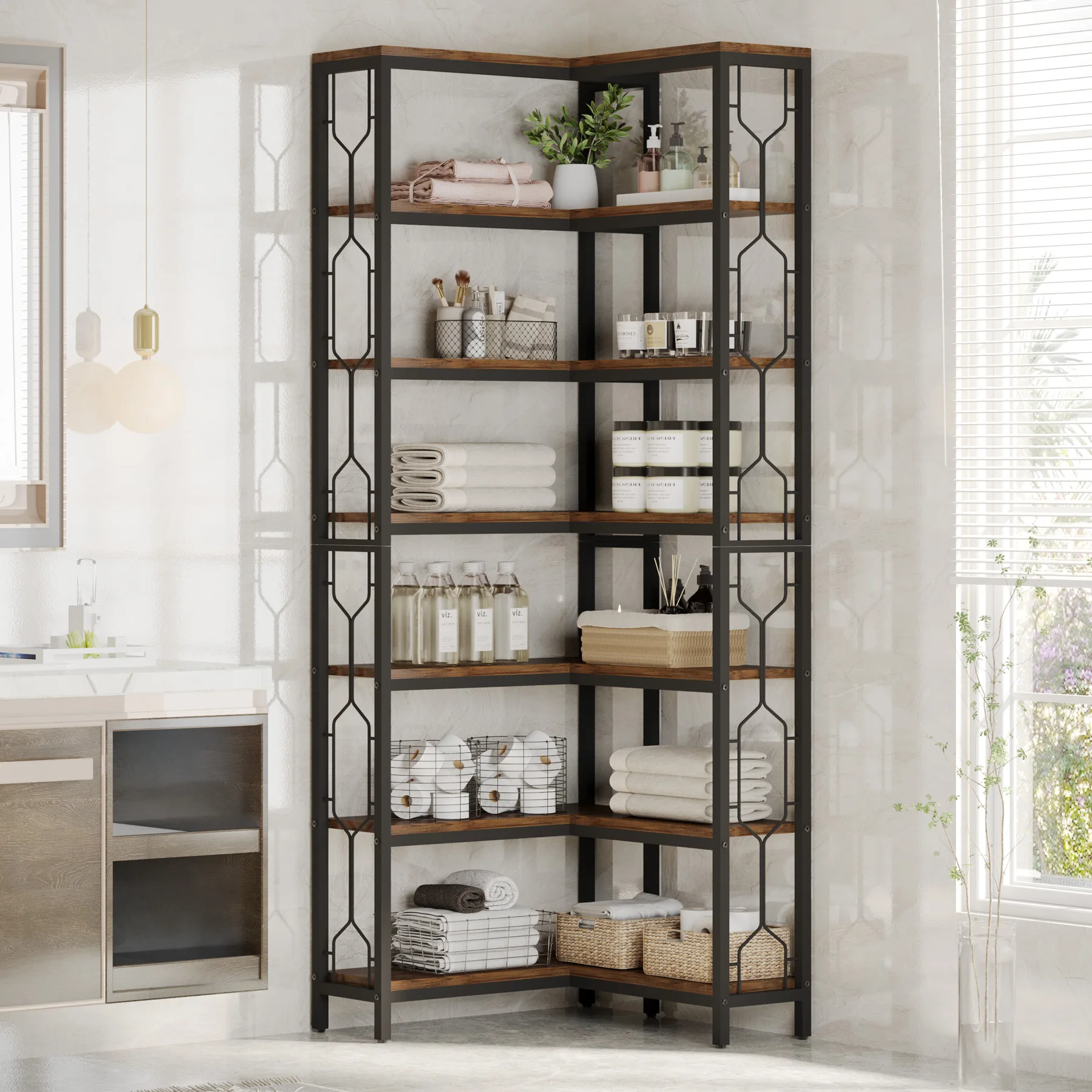 • MAXIMIZE YOUR CORNER SPACE: Say goodbye to clutter and hello to this 7-tier corner shelf! It’s a storage powerhouse that keeps your daily essentials organized, while its space-saving design allows it to fit perfectly in any corner. With its practicality and sleek design, it’s not just a storage solution – it’s a statement piece that will elevate the look of your space.