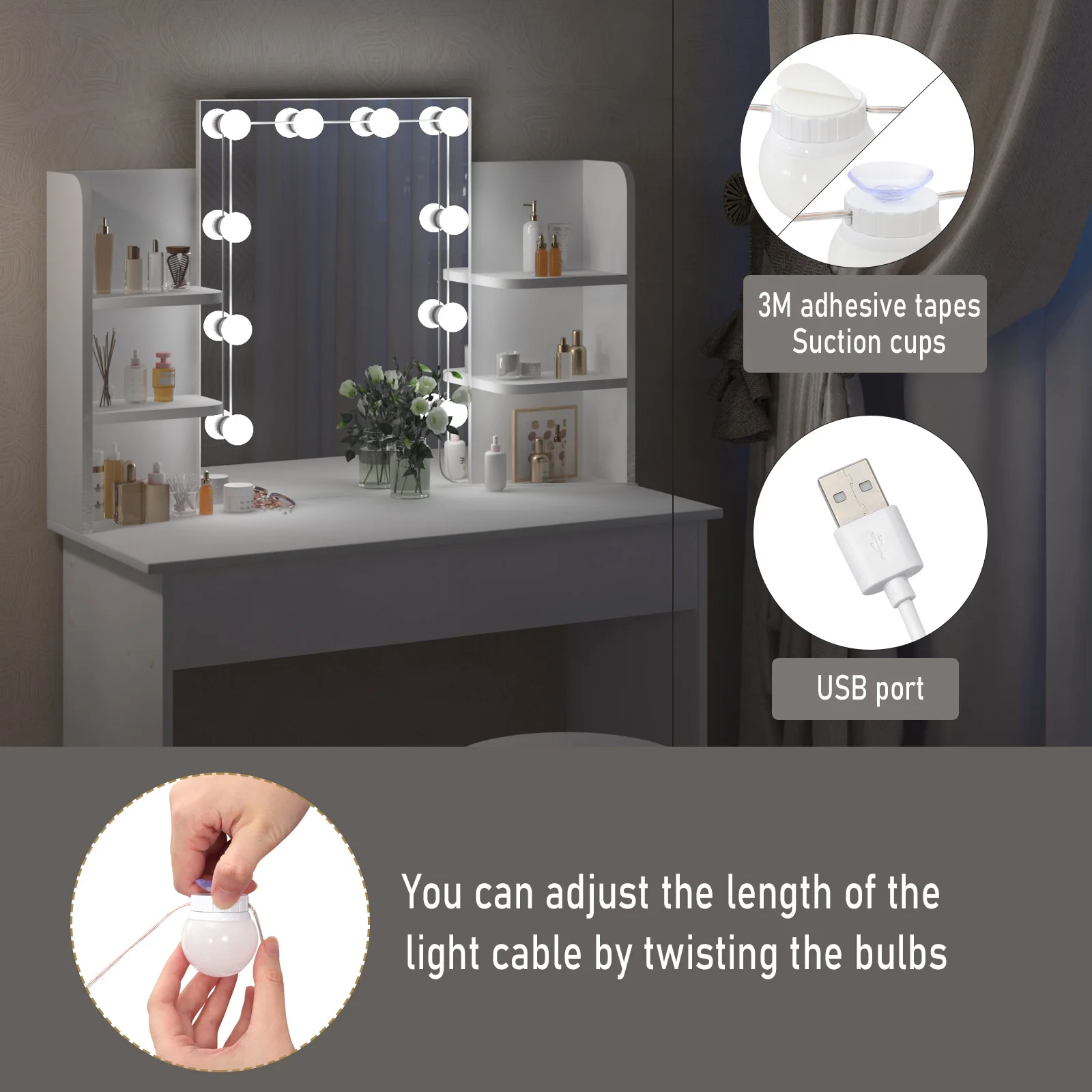 - ADJUSTABLE LED LIGHTS: With 3 lighting levels, the 10 bulbs with USB port can be placed freely on the large (45×60 cm) white dressing table mirror to easily create a Hollywood dressing table at home
