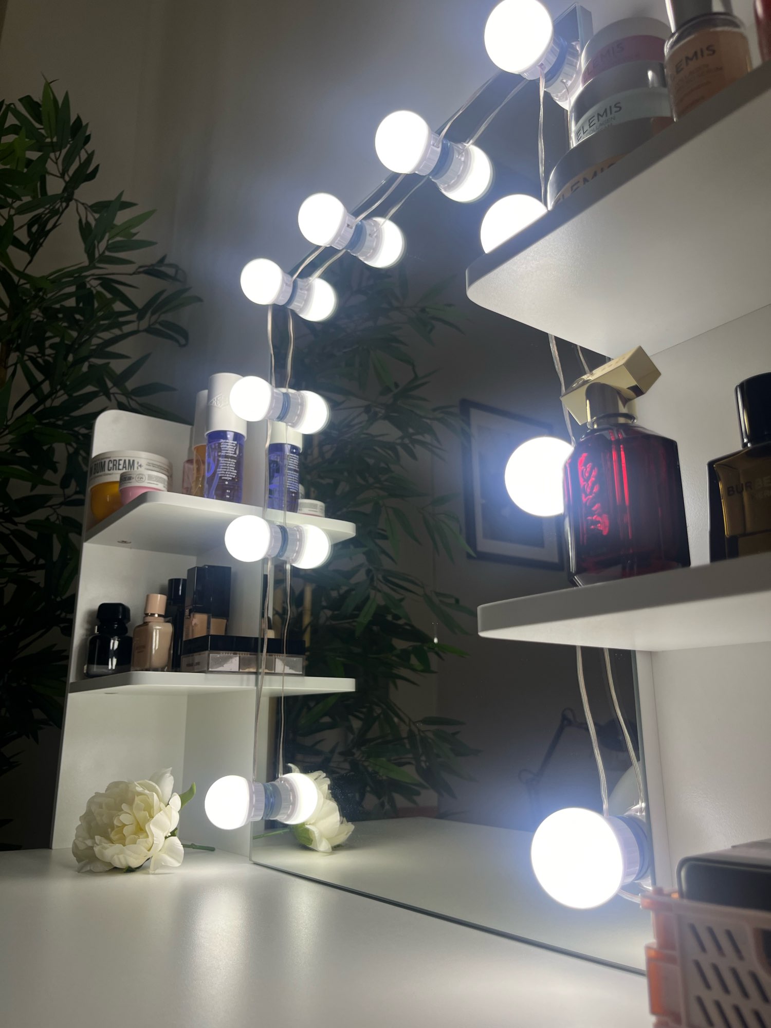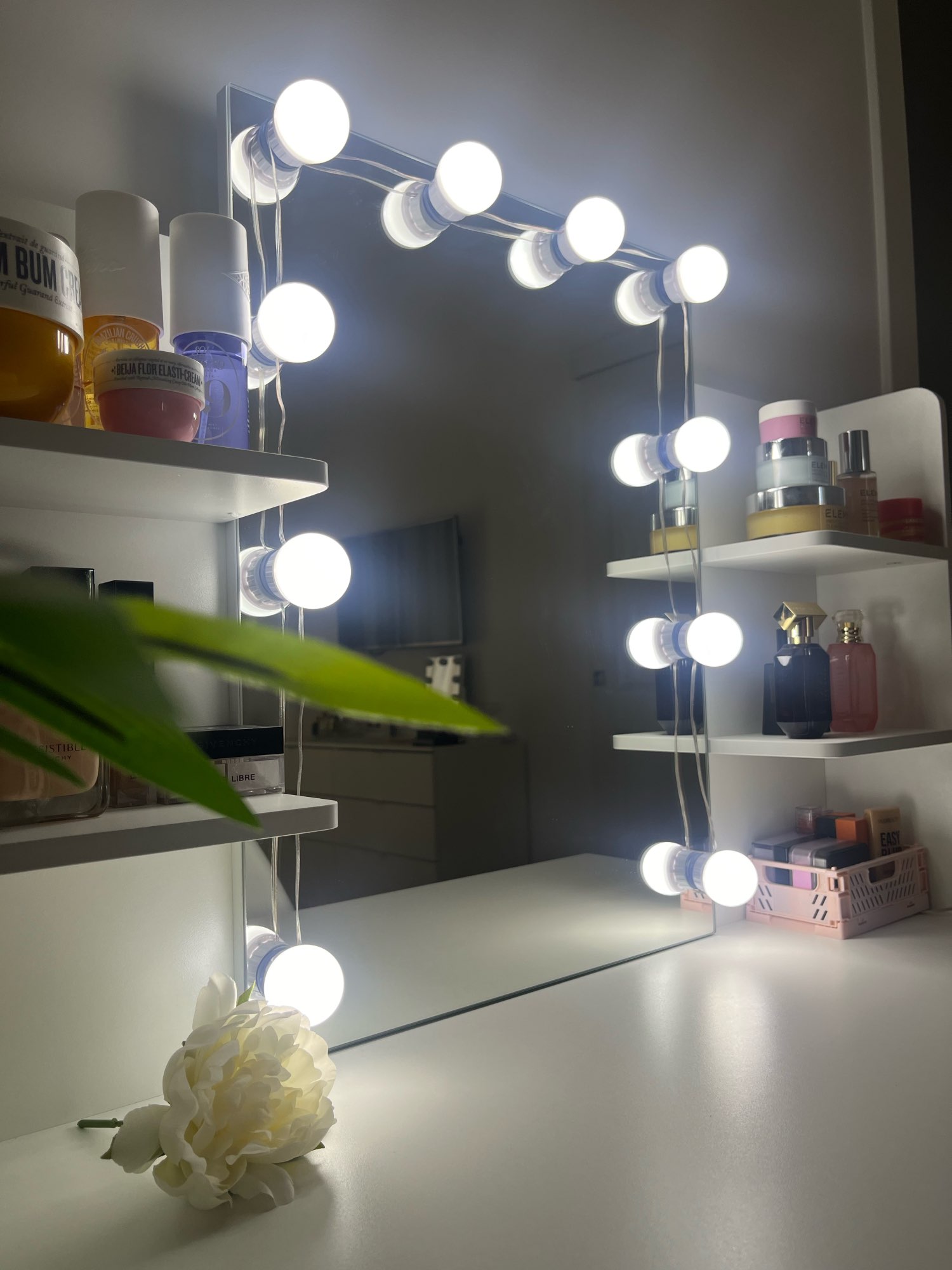 - ADJUSTABLE LED LIGHTS: With 3 lighting levels, the 10 bulbs with USB port can be placed freely on the large (45×60 cm) white dressing table mirror to easily create a Hollywood dressing table at home