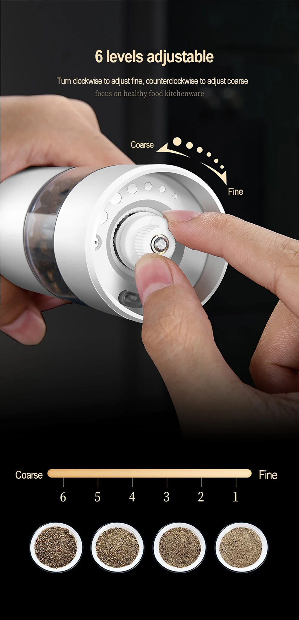 ✅ USB rechargeable design – This electronic pepper grinder has a built-in rechargeable 500mah lithium battery, comes with a USB cable, a Type-C adapter, and has a long standby time of 3 months. It only needs to be charged once to support the pepper grinder for 30 minutes of use (about 150 times)