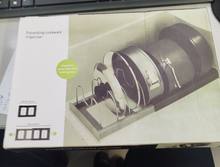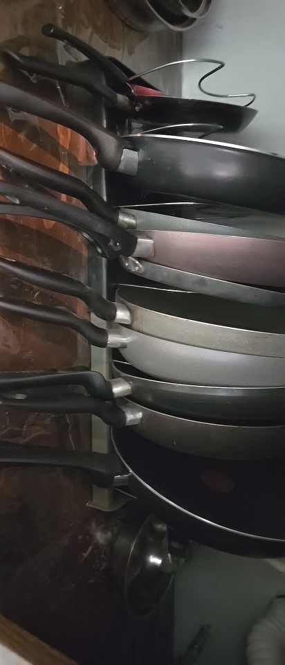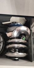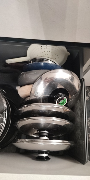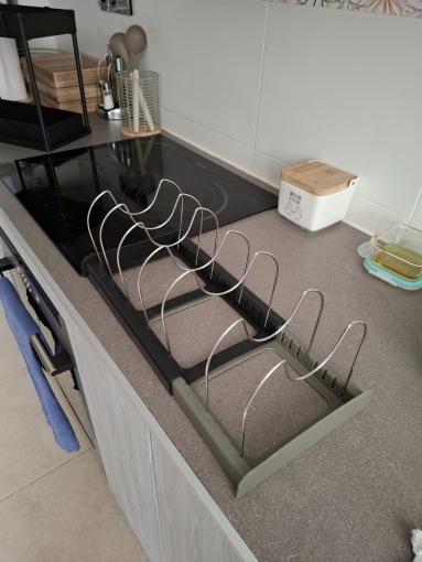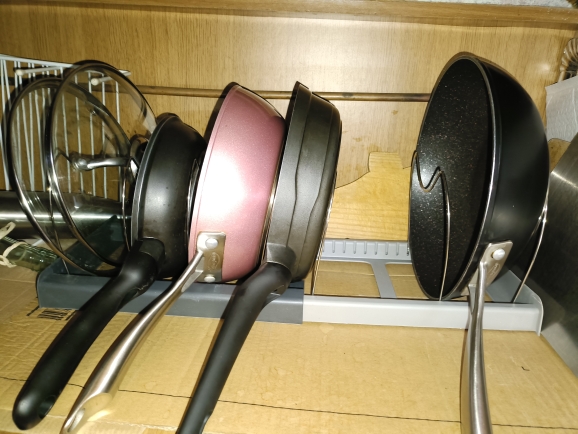 I ordered three shelves, one arrived damaged, but they refunded the money without any problems. Thank you very much, it suited me well, the lids found their place. The only downside was that I had a bit of trouble with the inserts; they didn't want to fit into the grooves, so I had to use a hammer and tap them lightly. Overall, it's a very necessary item, you won't regret buying it; all the lids are visible and in place. Super. Just what I wanted. I think I can do the same with frying pans 👍.