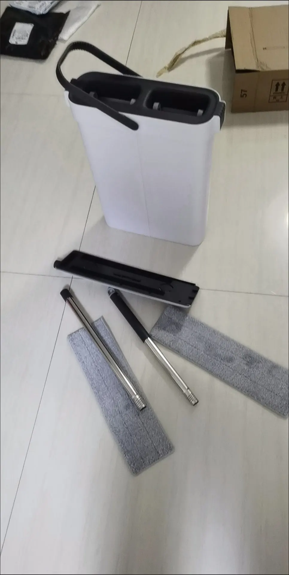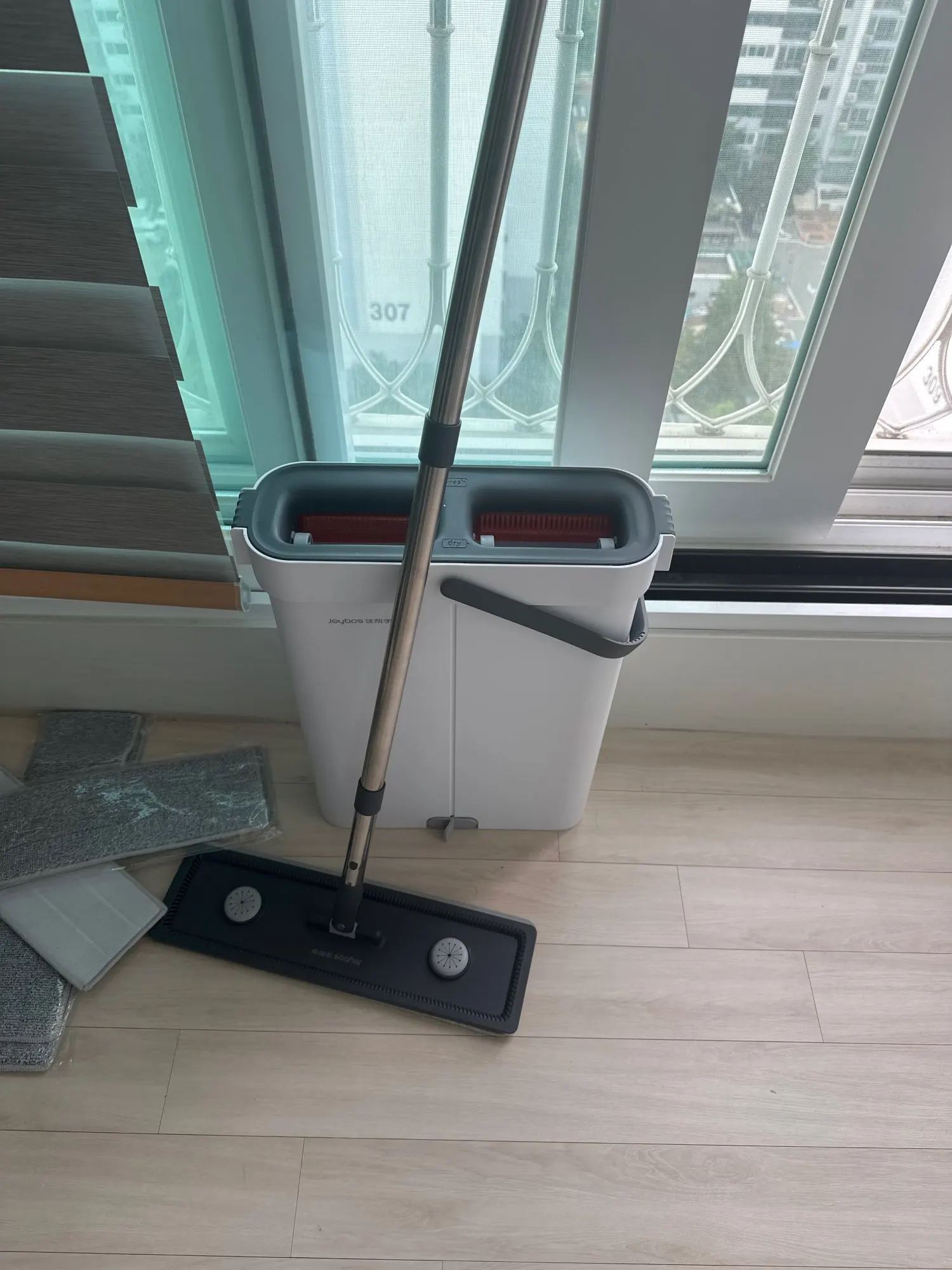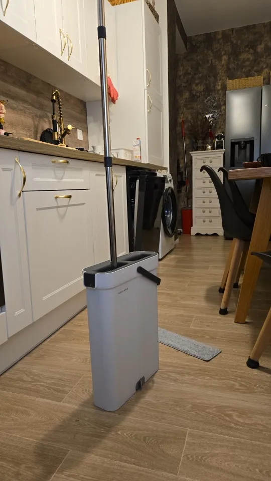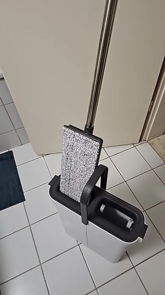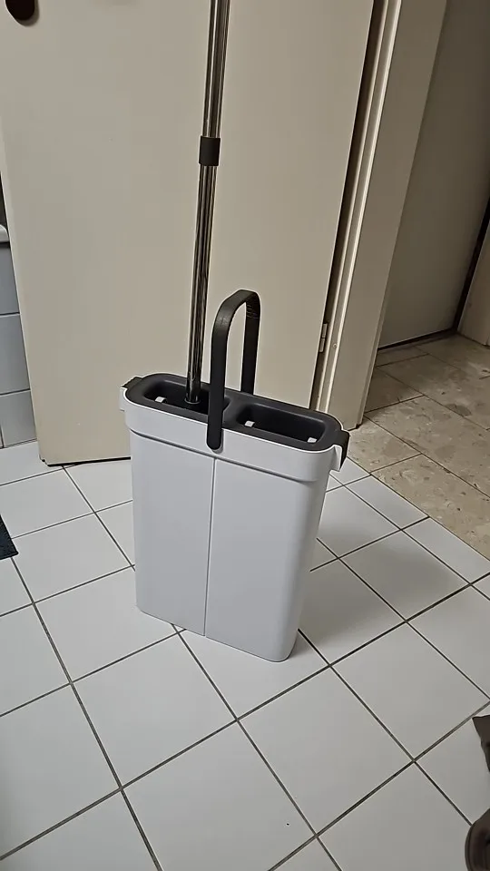 This product is a really good flat mop and water bucket. The mop head is very effective for cleaning corners between the floor and wall. It's lightweight, and the mop head is easy to attach. When mopping, you need to move the head around and occasionally tighten the handle with screws. But it's not enough to deduct one star. The cleaning part of the water bucket is very effective at removing dirt and debris from the mop head, and the drying part sends most of the water back to the cleaning part, so there's no need to refill water until it gets too dirty. When cleaning wooden floors, the drying part of the water bucket removes most of the water. Highly recommended.
