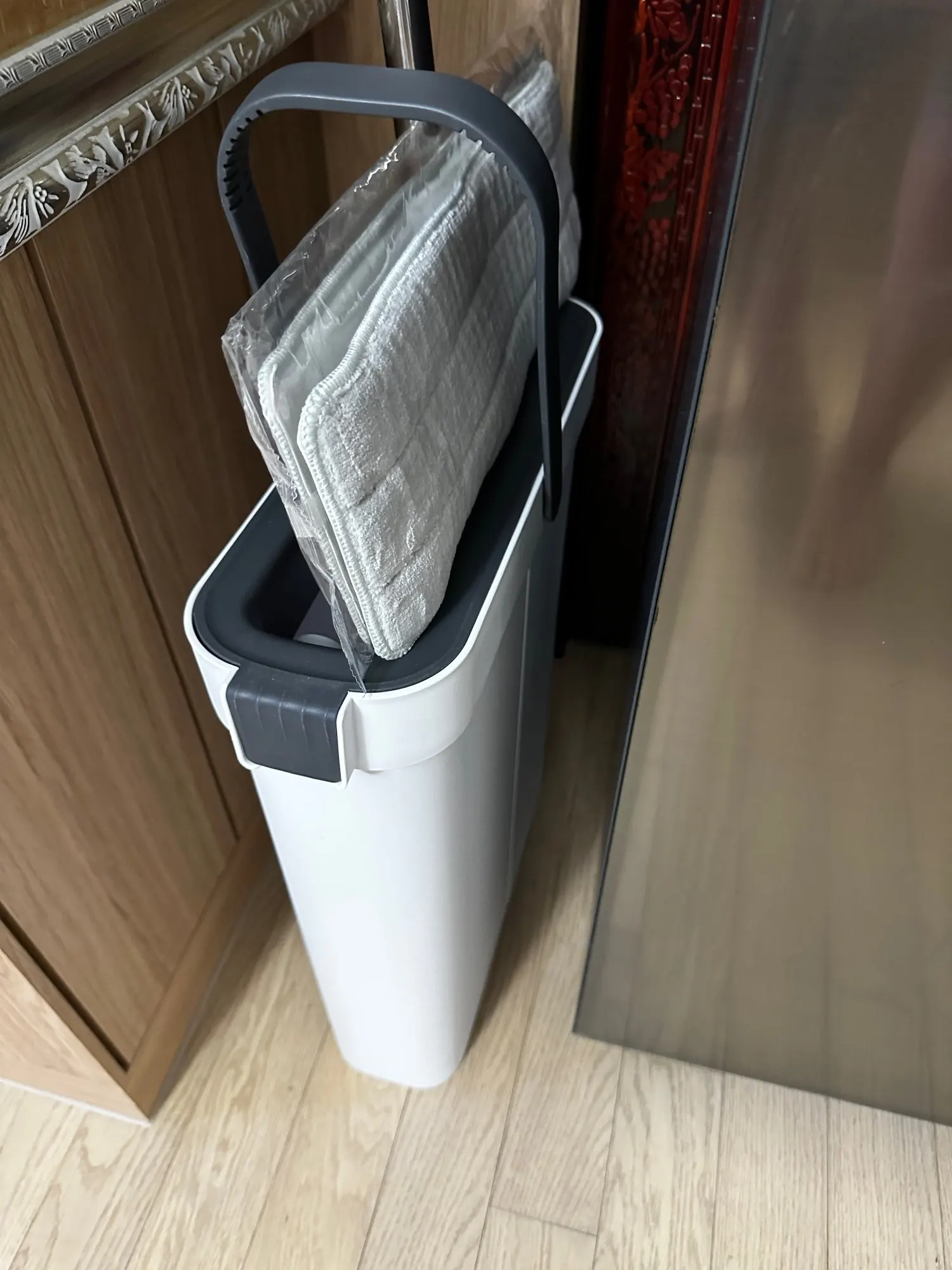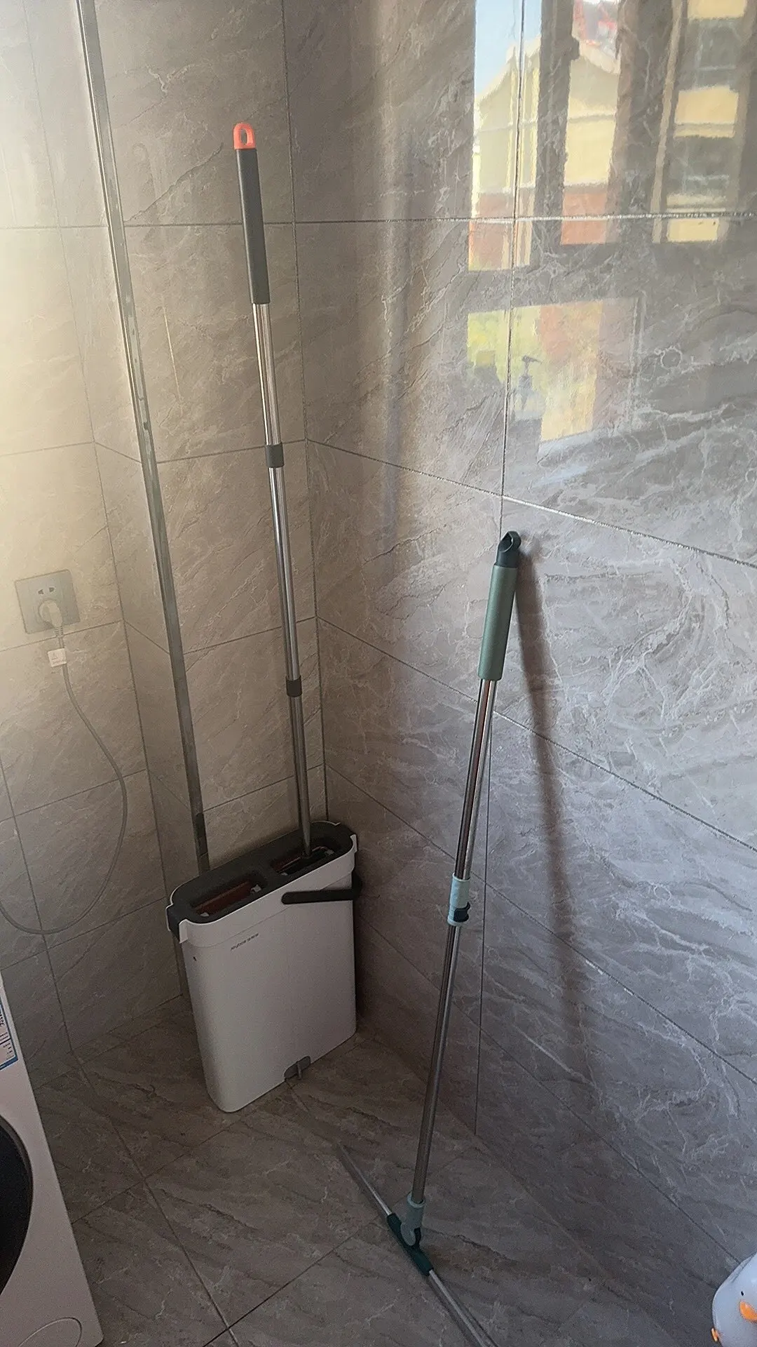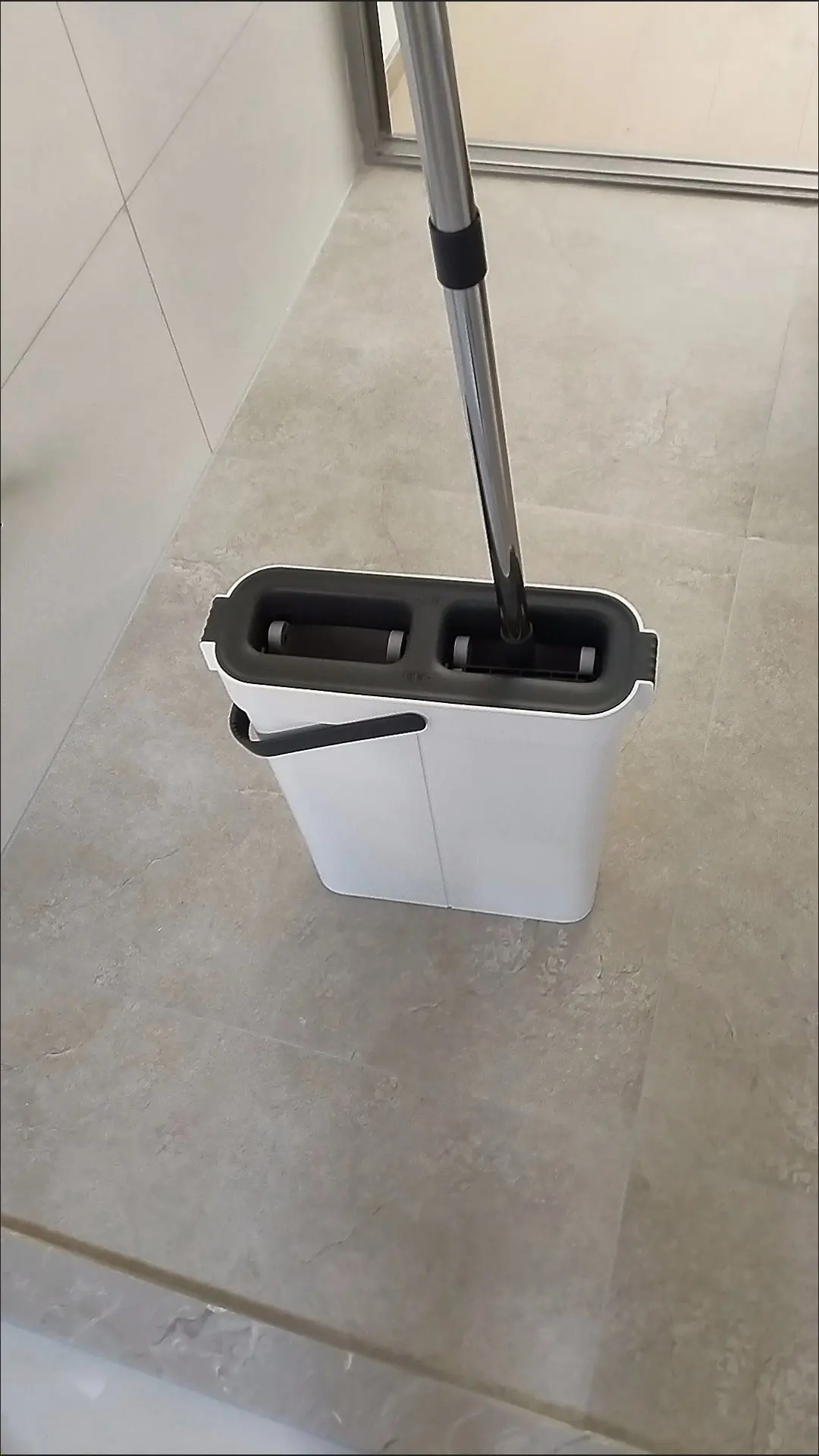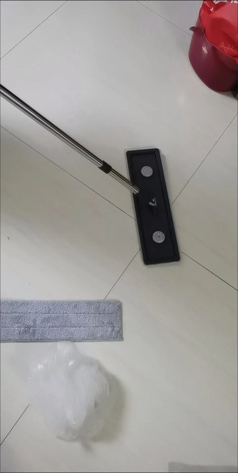 This product is a really good flat mop and water bucket. The mop head is very effective for cleaning corners between the floor and wall. It's lightweight, and the mop head is easy to attach. When mopping, you need to move the head around and occasionally tighten the handle with screws. But it's not enough to deduct one star. The cleaning part of the water bucket is very effective at removing dirt and debris from the mop head, and the drying part sends most of the water back to the cleaning part, so there's no need to refill water until it gets too dirty. When cleaning wooden floors, the drying part of the water bucket removes most of the water. Highly recommended.