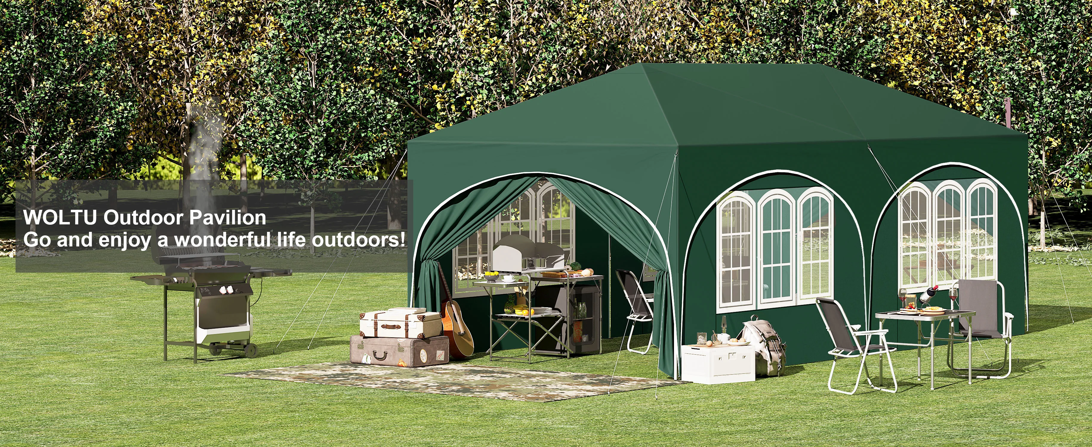 - 🌞SOLID STRUCTURE: The WOLTU folding gazebo frame is made of metal with powder coating to be rust resistant and durable. The 12 ground stakes and the 6 ropes of 2.8m reinforce the stability and the safety of use