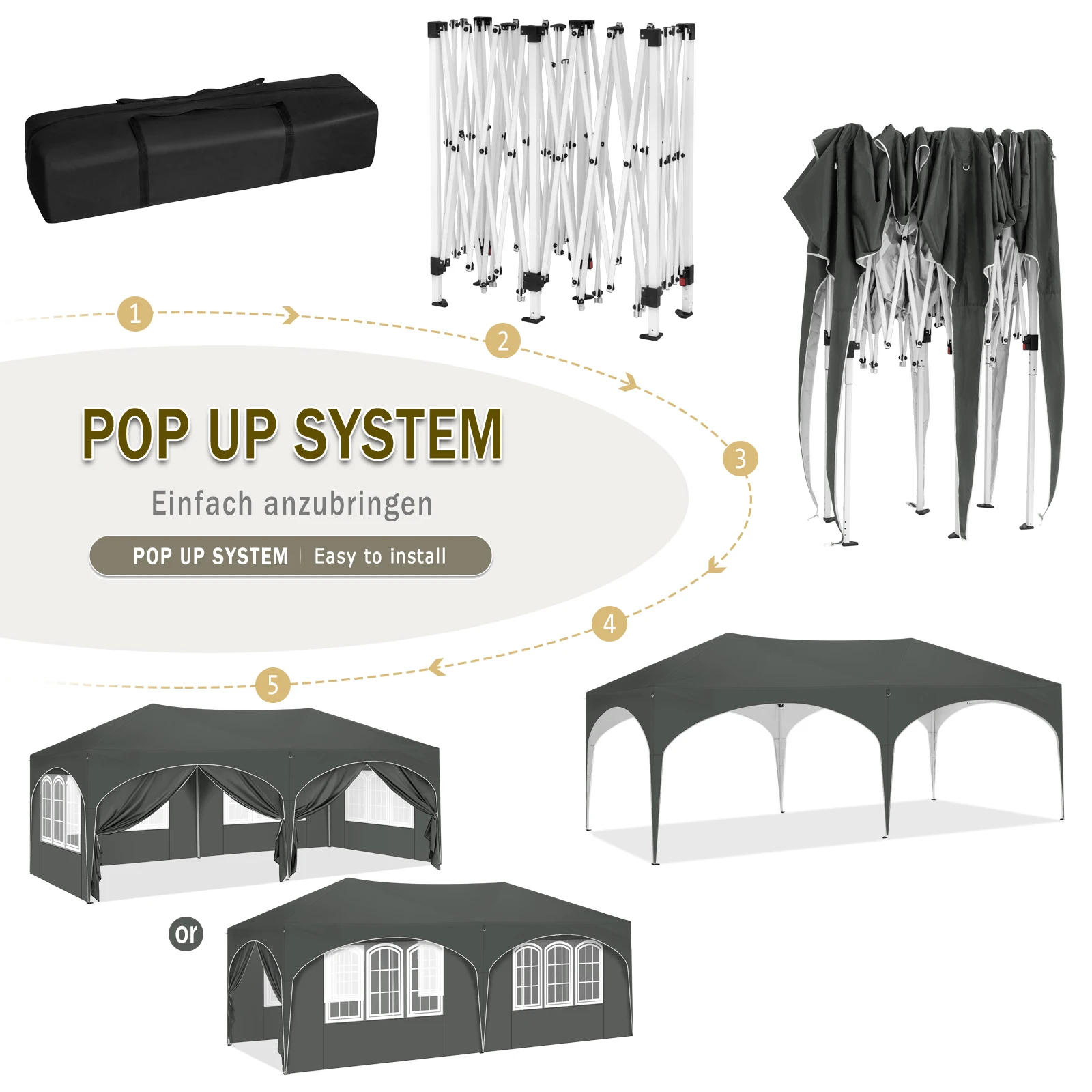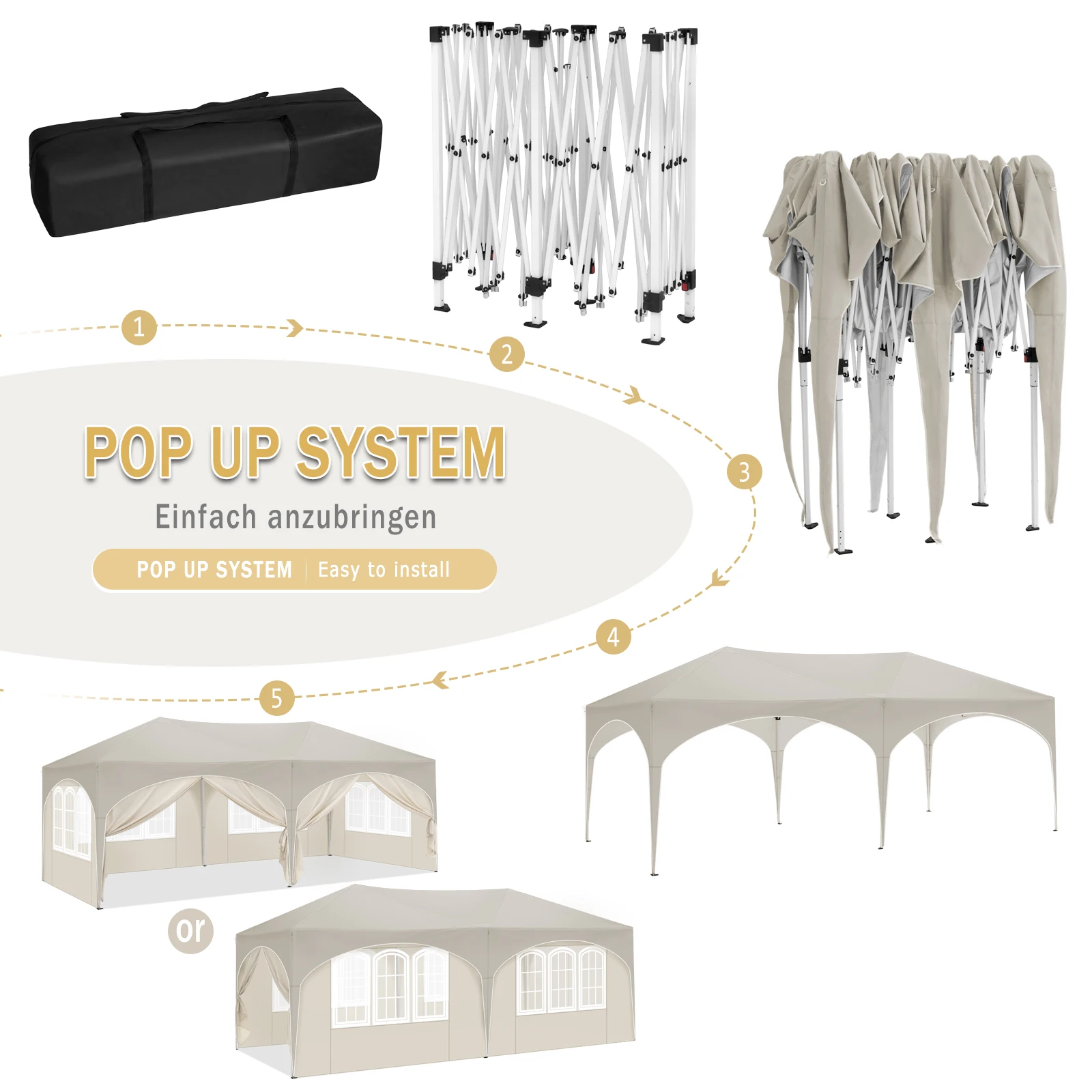 - 🌞EASY TO USE: The pop-up mechanism, the adjustable height (250/254/258cm), the 6 removable side walls with hook-and-loop fasteners, 2 with zippers and 4 with windows, everything is for practical use