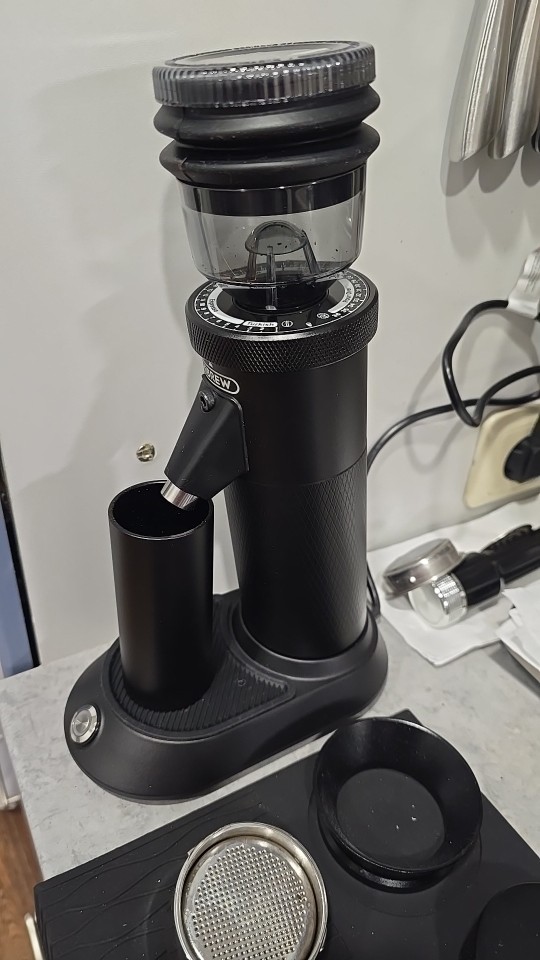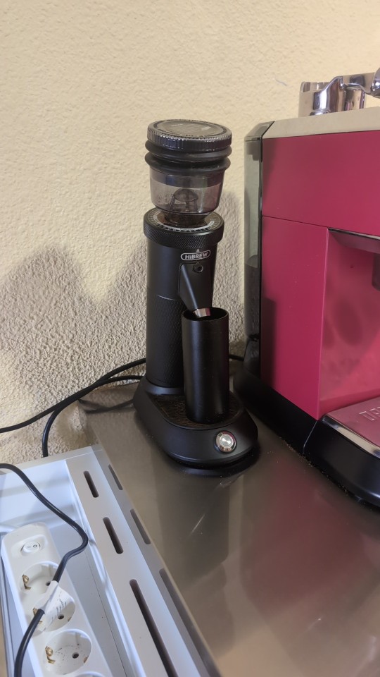 It is perfect for making an espresso with a bottomless, pressurized portafilter. I grind the coffee at setting 8-7, depending on the type of coffee, at a slow speed for a more uniform grind. The manufacturing quality is spectacular, almost everything is made of metal. It has two grinding modes, one fast and one slow, which is perfect for finer grinds. It makes hardly any noise, takes up little space, and is beautiful.