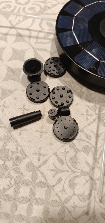 Very fast shipping and delivery. The 4 straws. They must serve to circulate water or air when placing the fountain in water, otherwise the pump is above the water. But the holes of the outer crown and the inner one are not aligned. Delivered in a box with instructions. 8 accessories for 6 different jets and 2 heights. Not yet put in the water but seems to be of good quality.