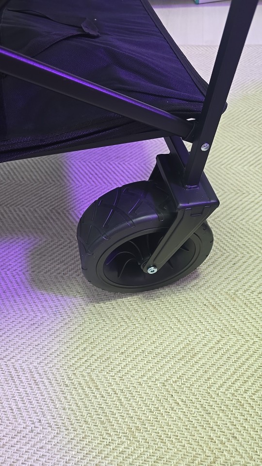 I also received the wagon in good condition. It's really big! I tried it out as advertised, and it's sturdy. The coating is also well done. The wheels are only for human heads. However, even when folded, it remains bulky in size. It was a finished product, so no assembly was needed. It's affordable and works well. I'll use it carefully. I recommend buying it as a set.