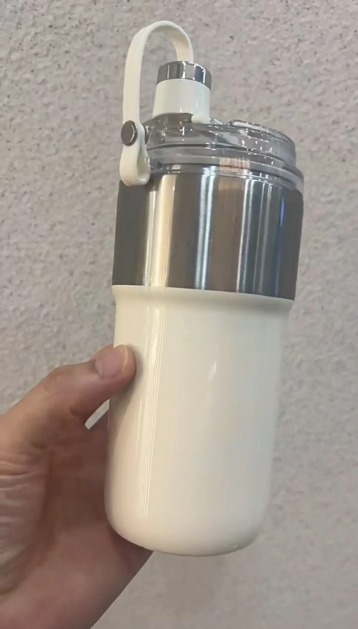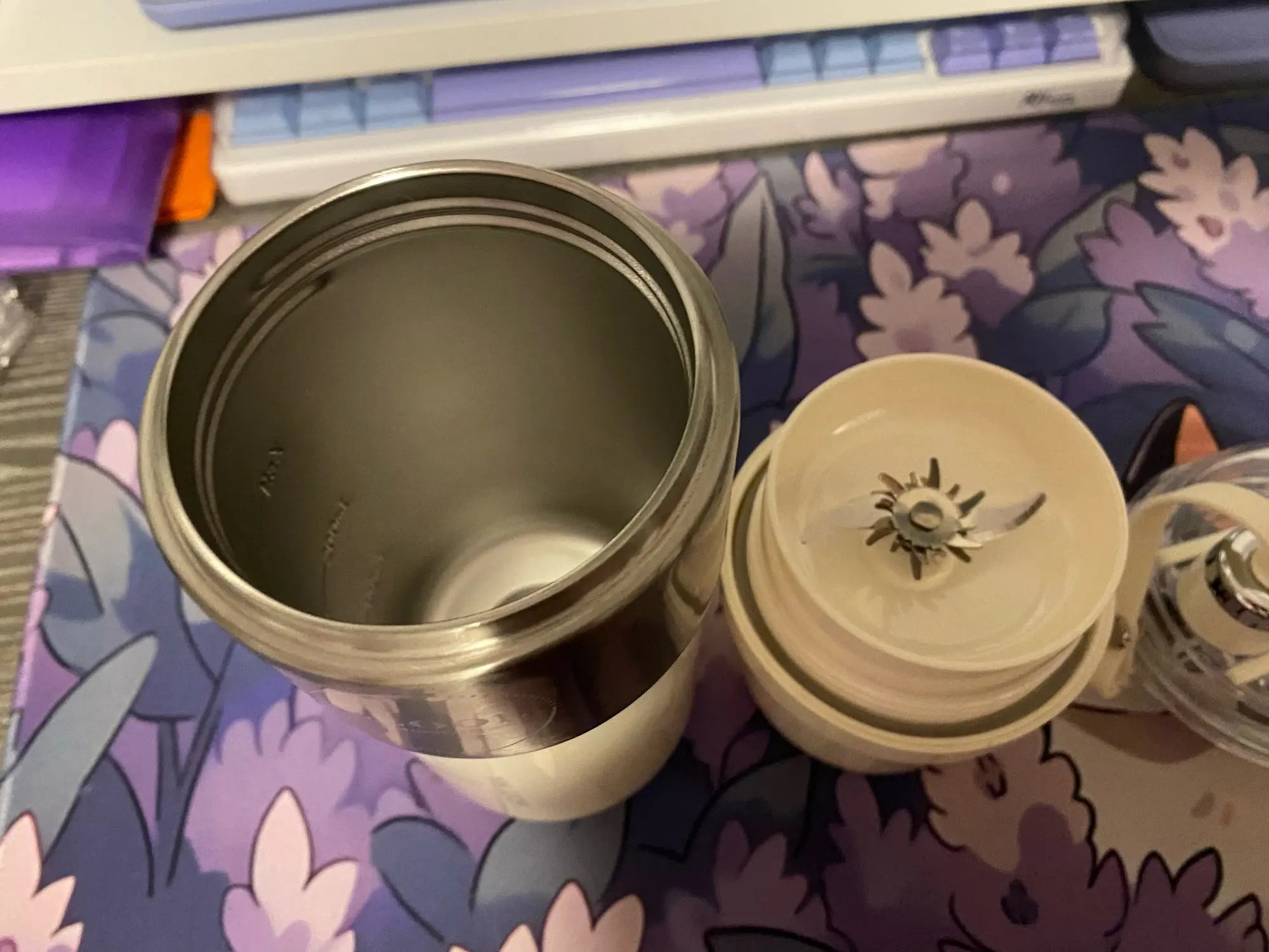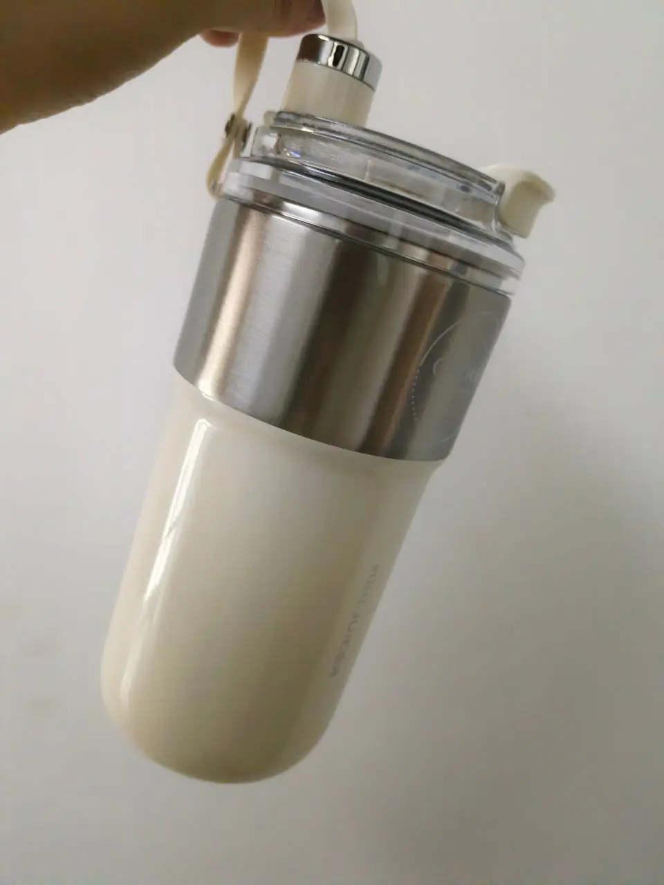 A perfect juicer with ample power and delicate juice. It has a cooling function and can be kept cold for five to six hours with ice cubes. Two covers have been replaced. Pick up a cup when you go out and enjoy a refreshing glass of fruit juice.
