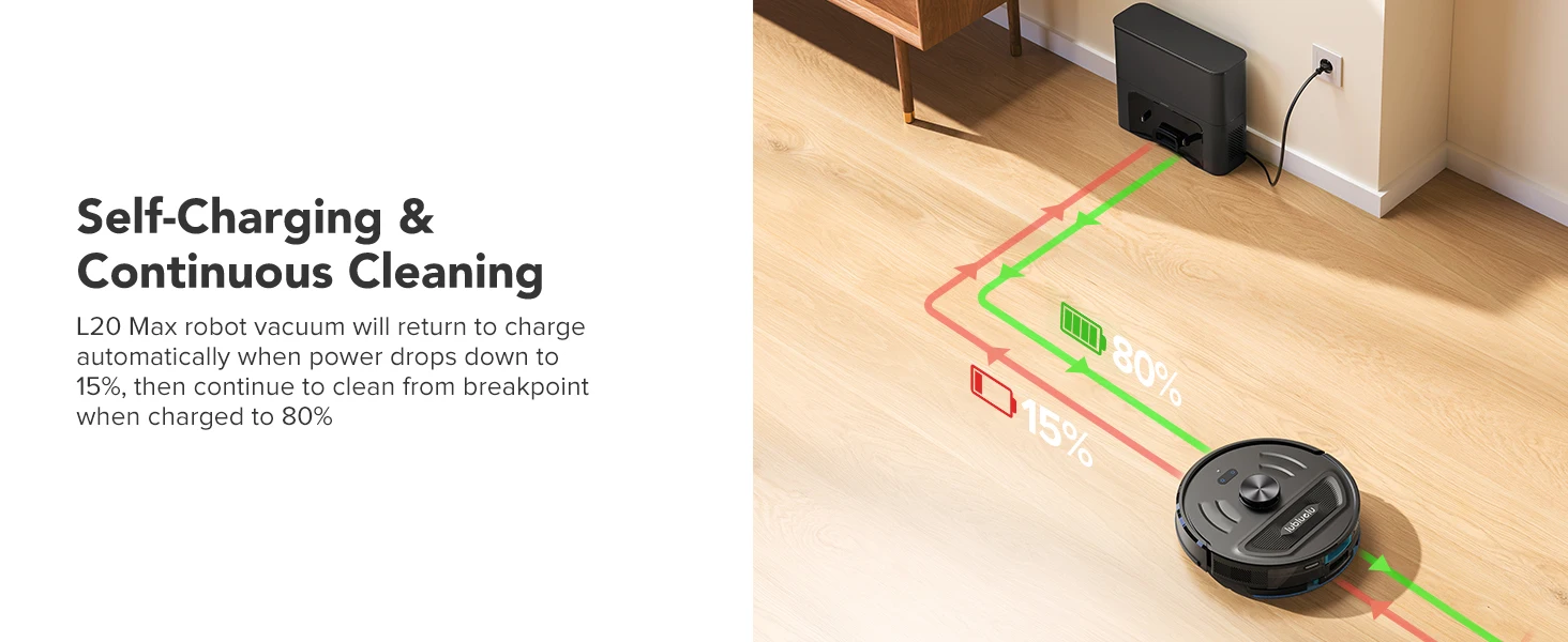 Recharge & Resume: Automatically returns to charge and continues cleaning
