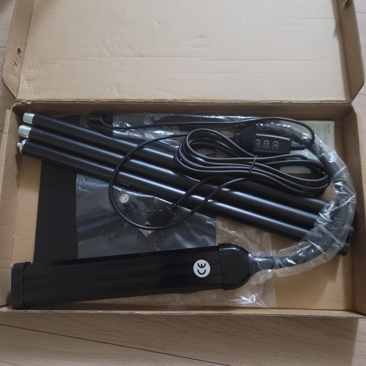 I received it quite quickly. One of the pillars was a bit loose, but when I tightened it, it came together well. I like the height and lighting position/direction adjustment, and the lighting temperature control and brightness adjustment functions work perfectly! The maximum brightness is a bit disappointing, but since it's powered by USB, it's unavoidable... Anyway, I got a good deal on a spot light fixture that can also be used as a lamp at an affordable price~ (Naturally, there is some heat generation, considering the price range, it seems like it's for short-term use and occasional temperature checks are necessary...)