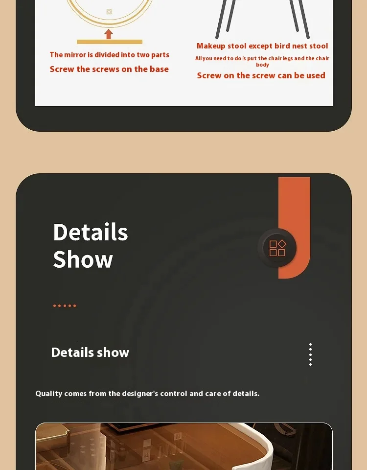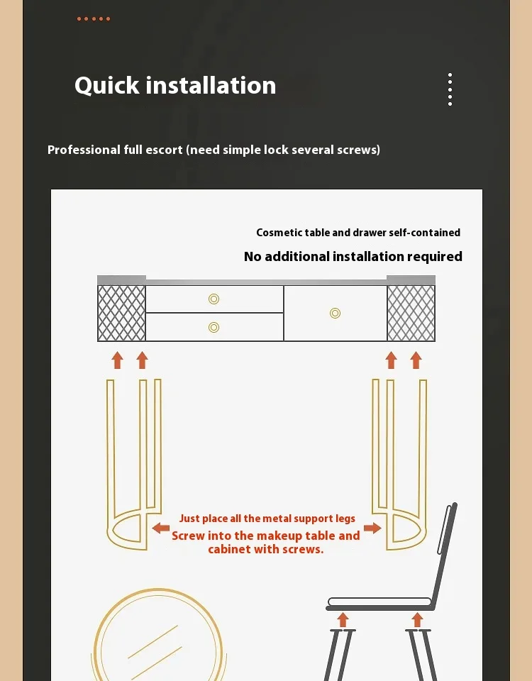 First let me say it visually beautiful and i bought this for my 8 year old…. The desk part with mirror arrived 1st and it was very nice but 1 screw was missing from one of the drawers but it was an easy fix…. But the mirror lighting is very poor, the lighting is not bright at all, at least it’s not fixed on the desk and i can find something better. The rest of the vanity ( legs and chair) came 2 weeks later and they were all damaged from shipping, the chair legs were bent out of place but i managed to slowly bring to place without breaking them. The screw for legs for the desk were all missing, again an easy fix to find similar screws. Overall it’s a beautiful desk but not a sturdy one it will work great for my 8 year old but i don’t think it would last if i was using it.
