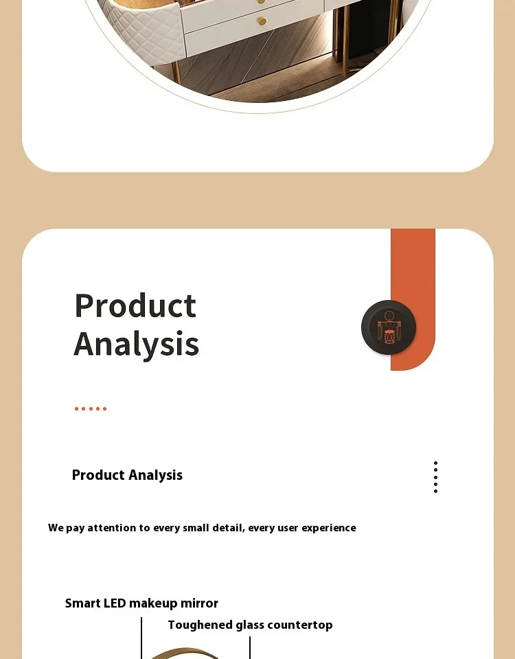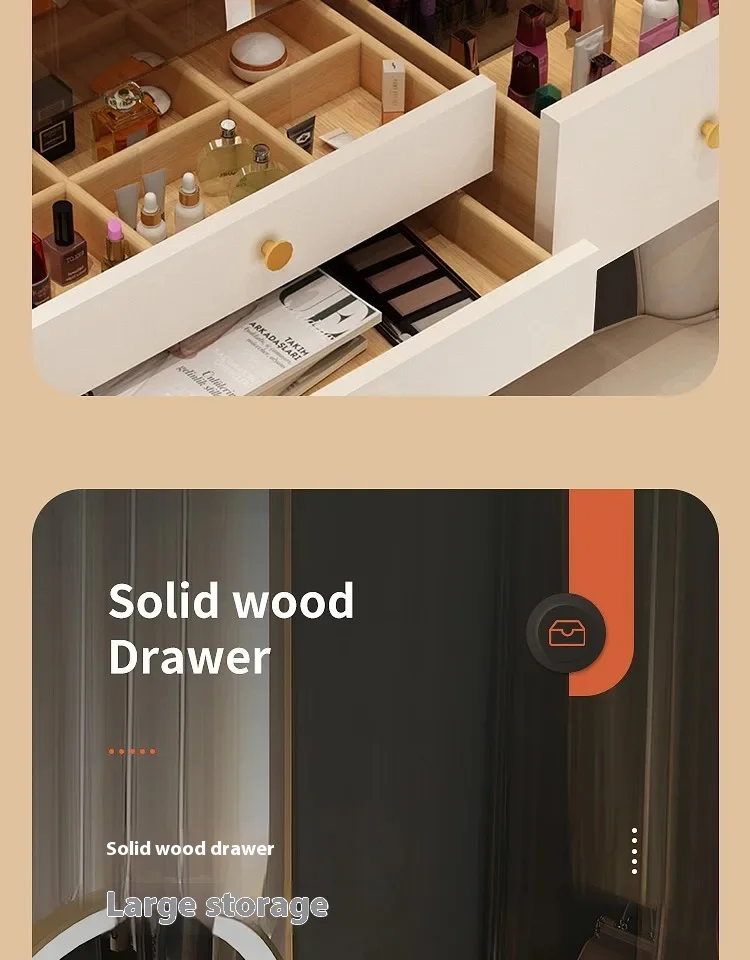 This dressing table has an elegant design, reasonable storage compartments, and smooth drawer sliding. Solid wood material is stable and durable, with rounded edges and corners that are resistant to bumps. Overall compact and space saving, suitable for bedroom placement.