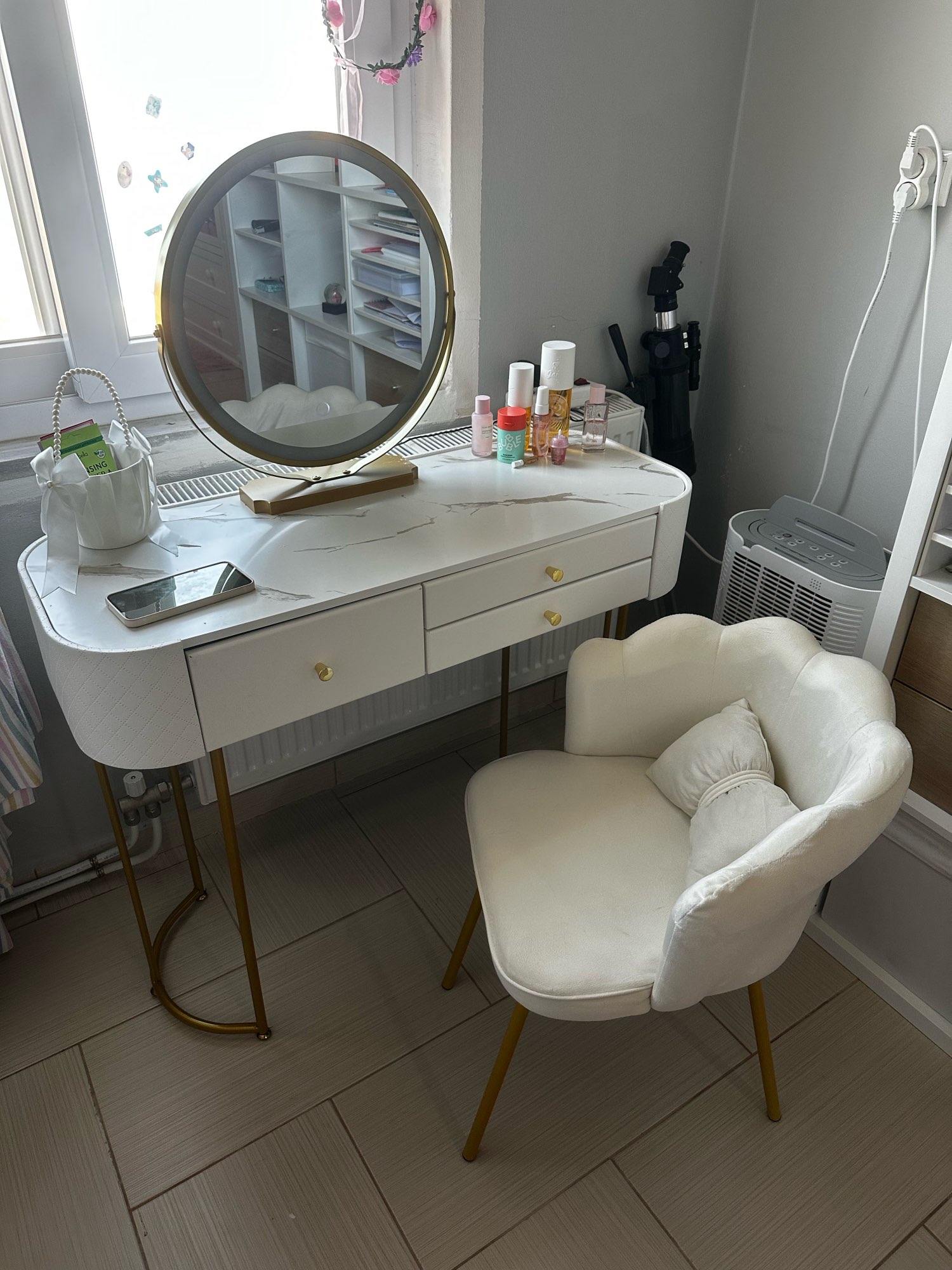 This dressing table has completely cured my procrastination! Sitting here doing makeup every day feels like checking in at a coffee shop. The led light has three color temperatures to choose from, and i'm no longer afraid of getting a yellow face when taking night photos. The drawer comes with a jewelry compartment, so i finally don't have to search for needles in a haystack among necklaces. The mirror just makes my face look a bit small, and my best friend said i've been taking selfies swollen lately