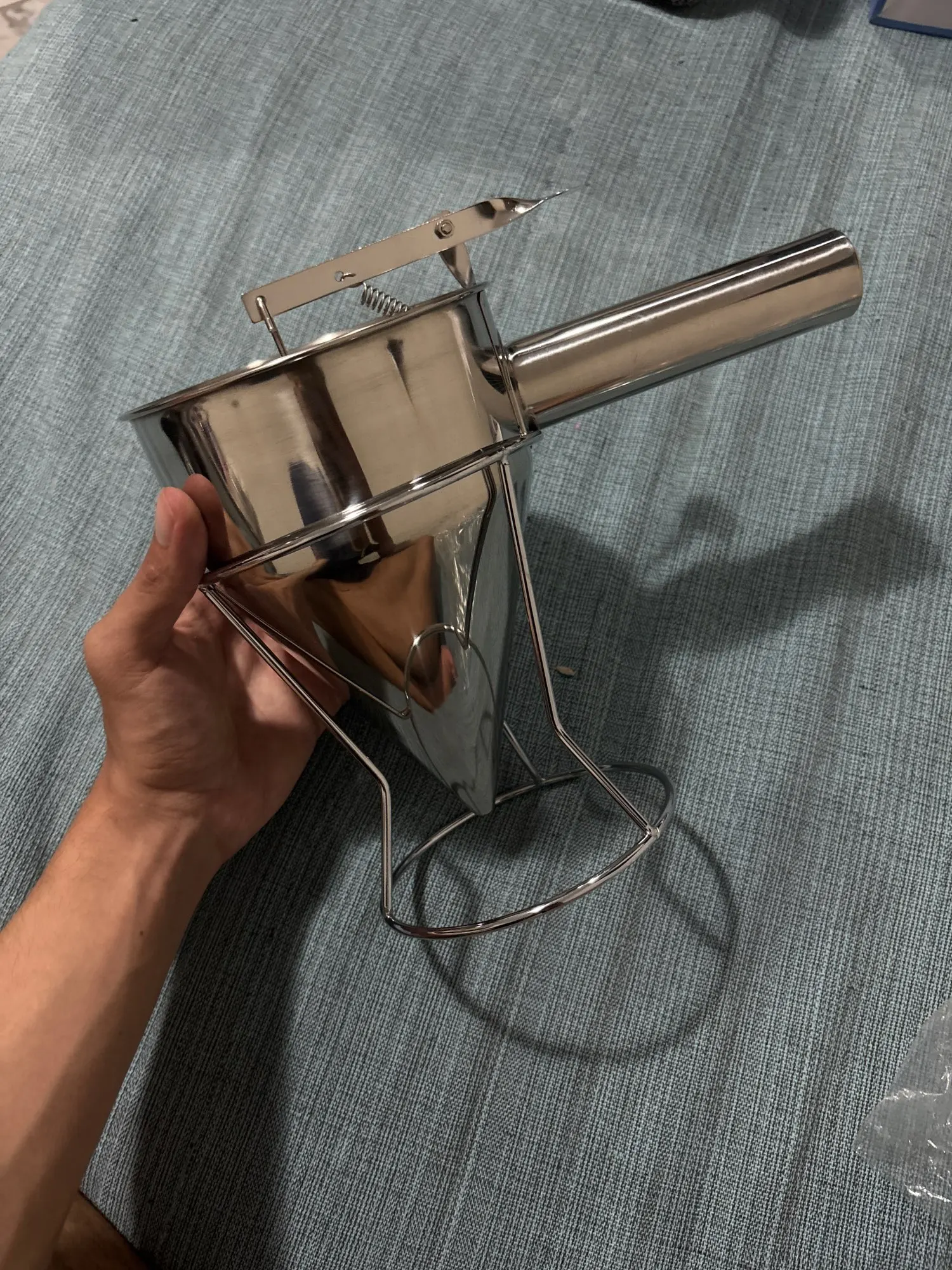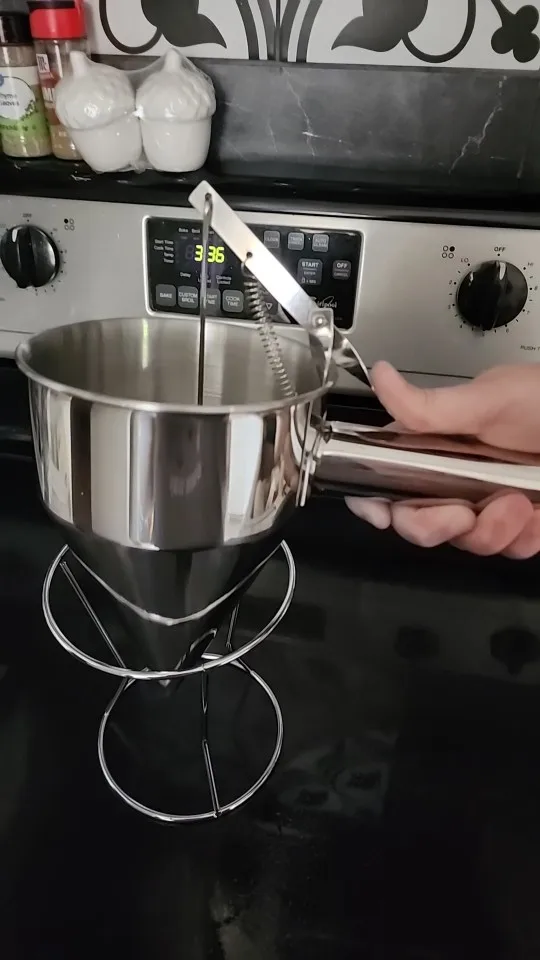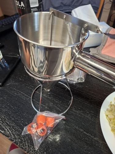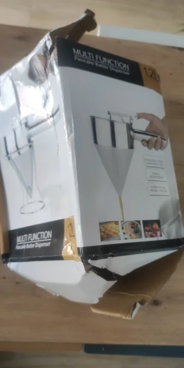 The packaging came a little crushed, but it didn't damage the product. The funnel is very light, but quite resistant, and the dosage lever works well. I will test making puddings