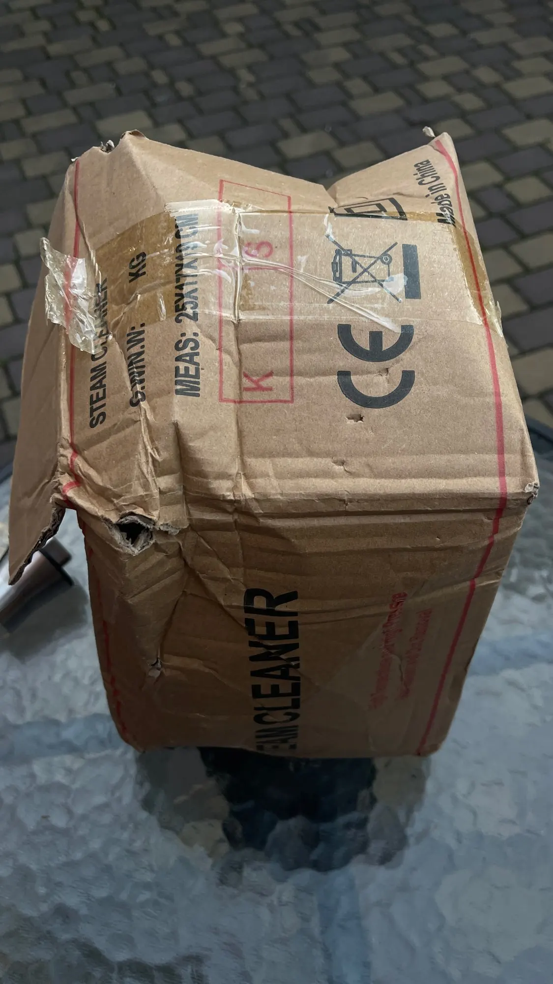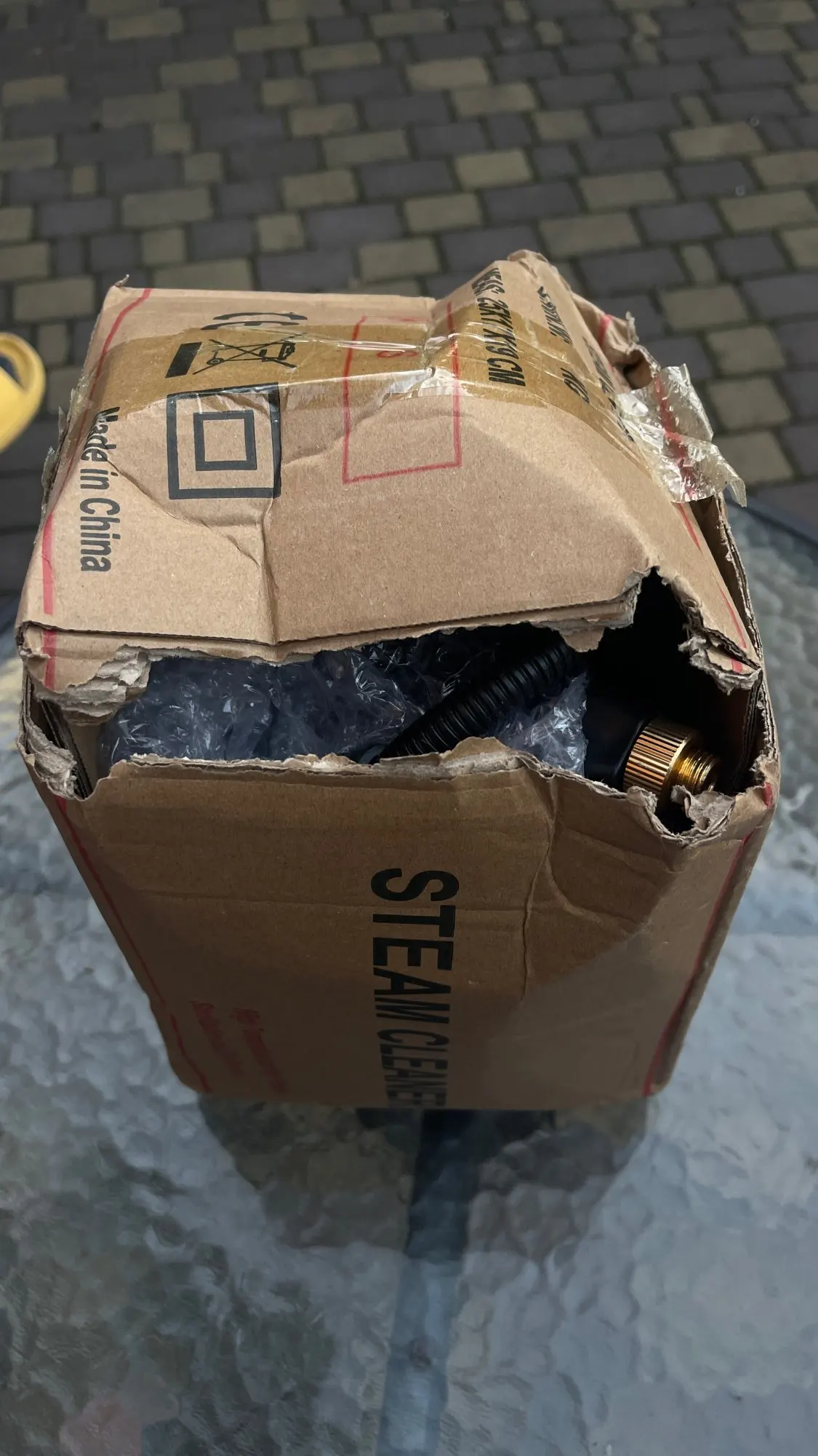 Arrived in a very wrinkled and even opened box. The device itself is surprisingly undamaged. Our carrier is not very reliable.