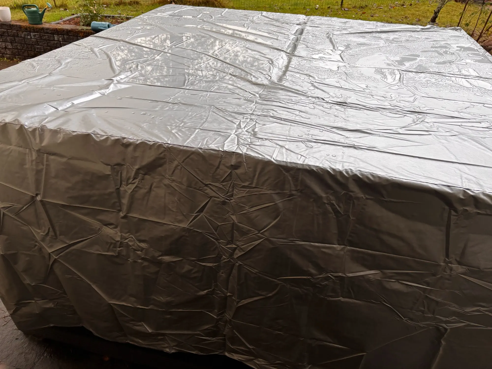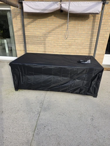 Excellent raincoat for garden tables, to spend the winter protected from inclement weather. It comes folded inside a bag-sack of the same material, to be stored in it when not in use. At the bottom, it has an integrated cord to adjust it so that the wind doesn't get underneath and blow it away, but I have secured it to the legs with some fishing rod holders for added safety. Excellent product.