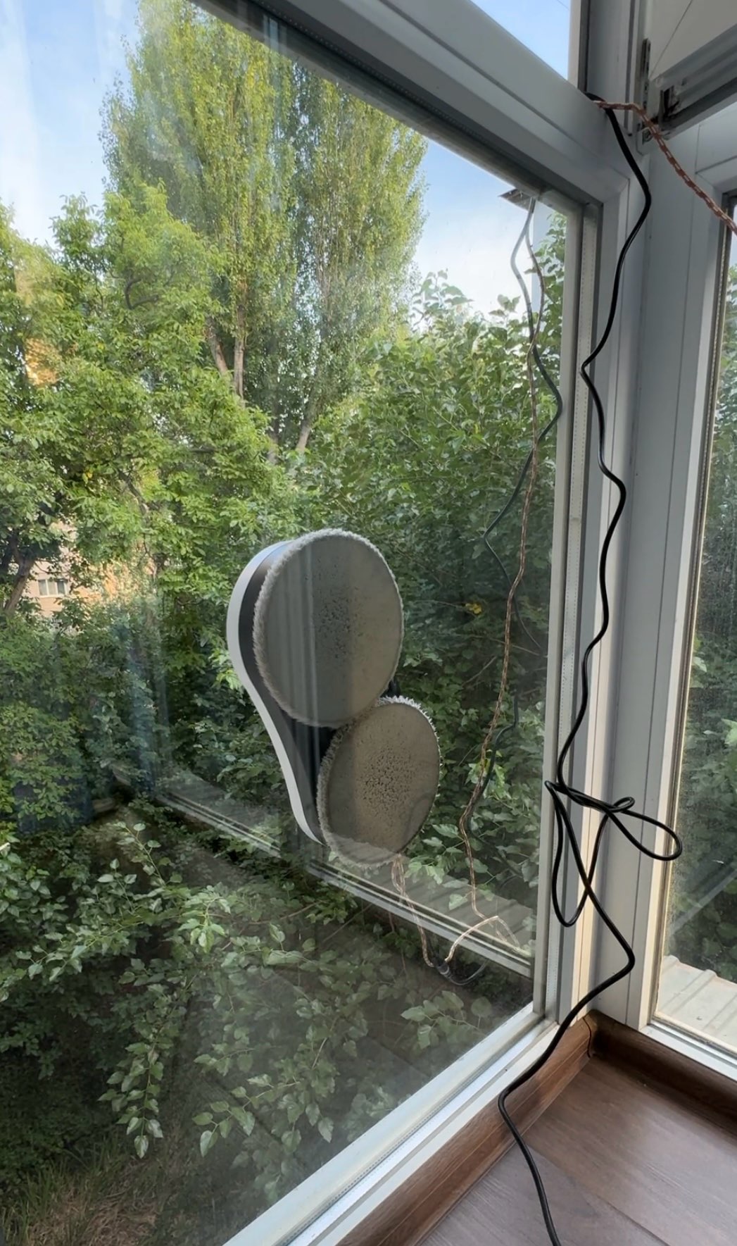 It sticks to the window and works well without falling off. The wire length is long, so even if you stick it on the outside window and wipe it, it cleans well enough, and it has a safety loop so it's safe even if it falls from the window. Since the quantity is sufficient, we can quickly replace them after cleaning.
