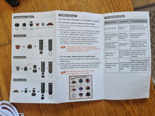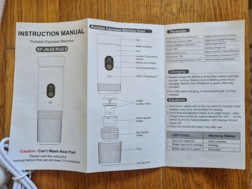 Works as expected, heating the water does take around 5 minutes as the manual says, the only negative thing is that it seems to have something tiny and loose when i move it up and down, other than that it works great, it came fully charged and it has everything for coffee grounds but also capsule use. I tried with ground coffee and worked almost as good as my espresso machine, it's not perfect but comes close especially the on the go which makes it amazing. I need to try with capsules and see how it performs!